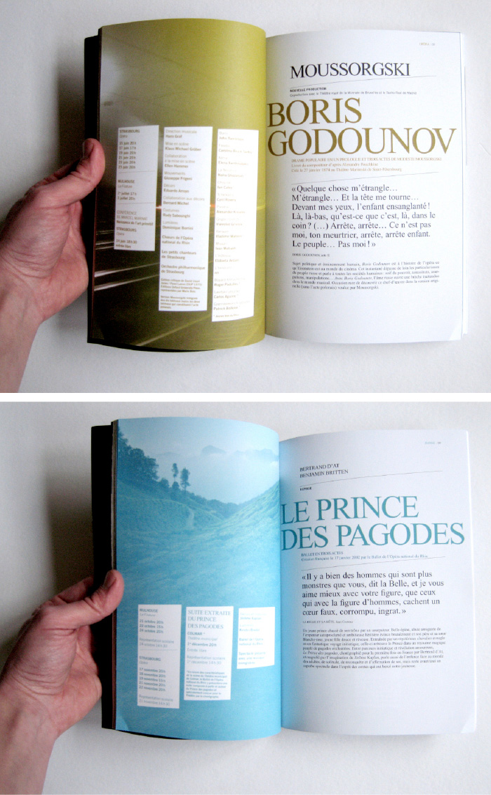 Notre travail graphique pour l’Opéra national du Rhin comprend aussi les conceptions et réalisations des programmes, du journal trimestriel destiné aux abonnés, et de multiples outils de promotion des spectacles.